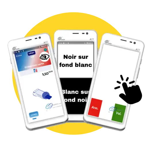 Le mode malvoyant sera activable directement depuis l'écran d'attente de la carte, via une icône dédiée accessible au caissier ou au porteur lui-même. Une fois activé, l'application proposera de choisir entre deux options de contraste : noir sur fond blanc ou blanc sur fond noir. Le porteur sélectionnera le contraste qui correspond à sa déficience, puis poursuivra la transaction normalement.